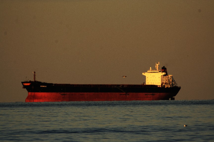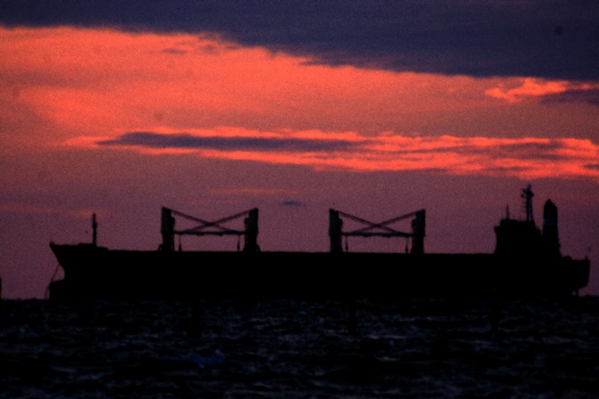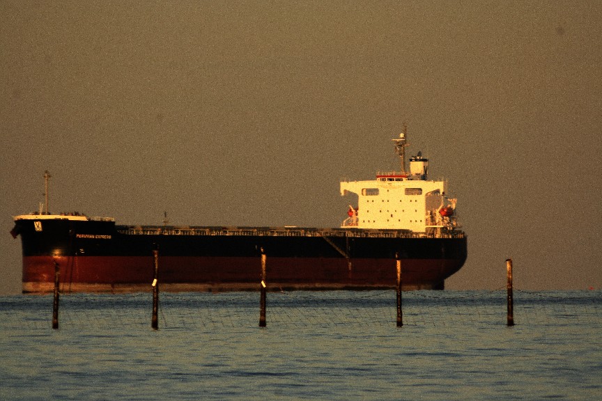 The sun sets on the Peruvian Countess, riding at anchor on tanker row, awaiting her turn to be laden with oil and to begin yet another journey across the globes' oceans.