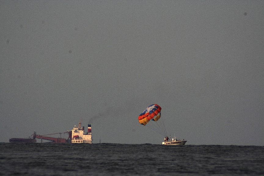 Beyond the horizon a cargo ship passes by the vacation-pleasures of parasailing over the mouth of the bay...