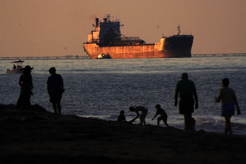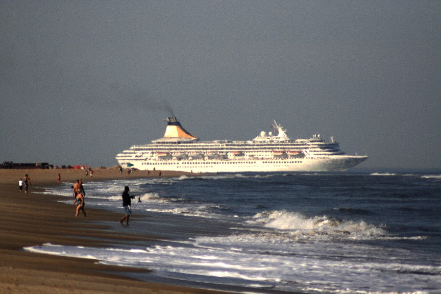 Dwarfing beach-goers, this cruise ship leaves the Chesapeake Bay, a glowing jewel in the afternoon sunlight