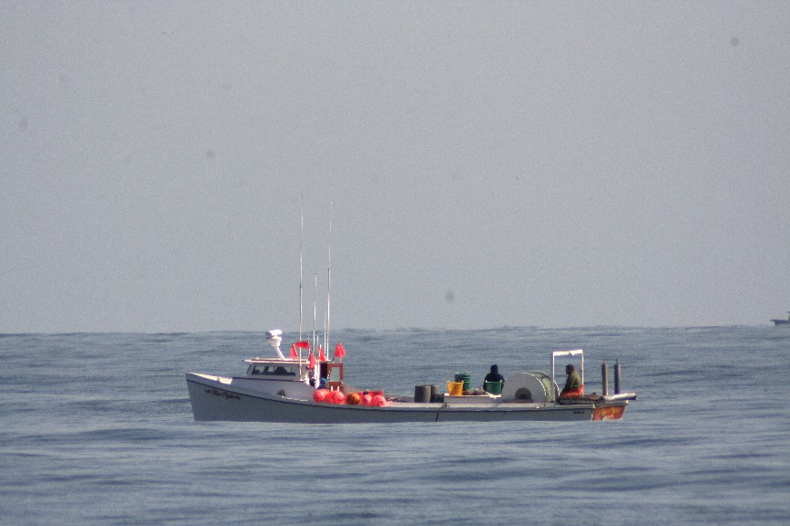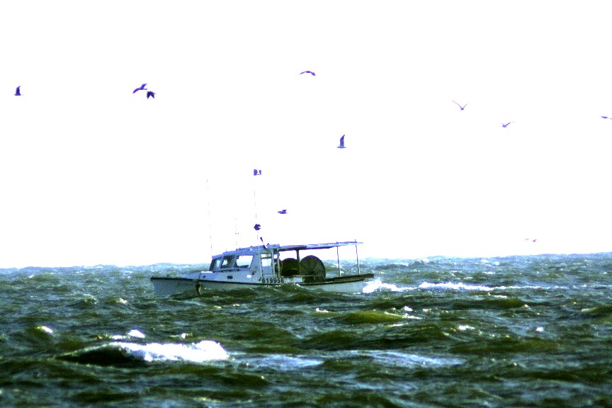 Sea birds, ever-watchful of all that comes and goes from bay waters, content themselves with the fish at hand in this pound net--a smorgasbord of delights, no doubt