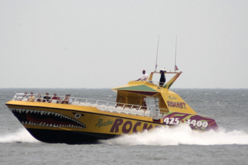 The Rudee Rocket, a proposed boat for SEAL operations that wasn't quite what they wanted, can hit speeds up to 60mph across the water. Capable of carrying some 50 people or more, the Rudee Rocket is now used for scenic excursions and dolphin-watching