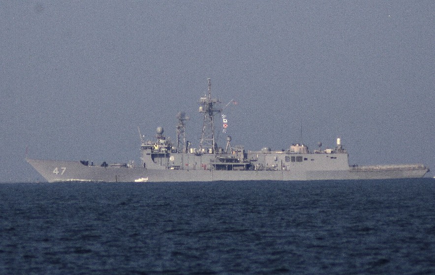 The USS Nicholas FFG-47, dwarfing a pleasure boat at its port-side, approaches the Chesapeake Bay Bridge Tunnel