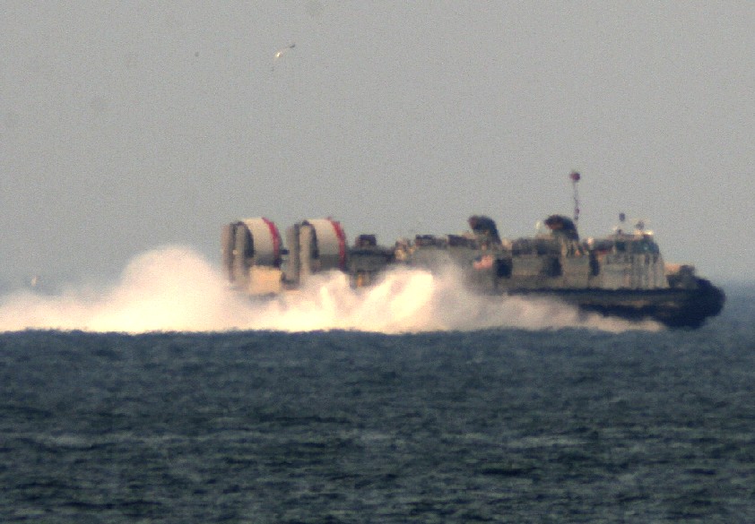 A Navy Hovercraft skims over the bay's waters at speed, a charging juggernaught in hands trained to fight for our way of life!