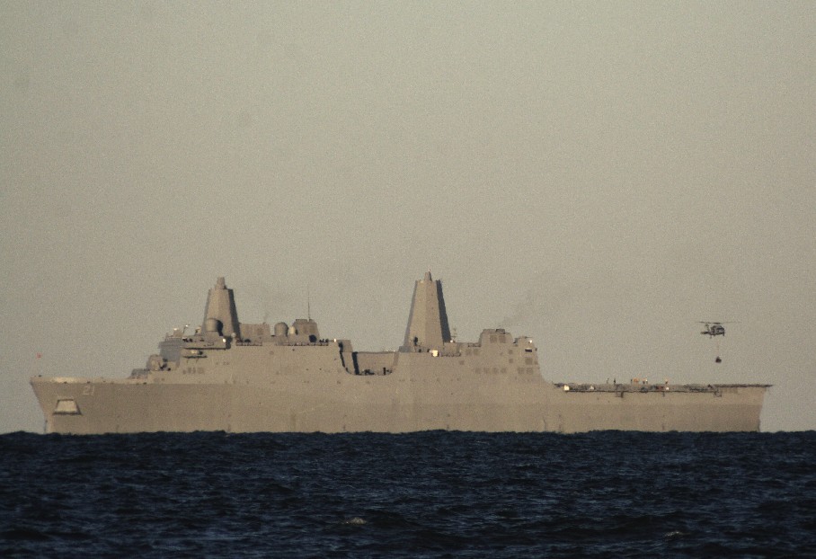 USS NEW YORK (LPD-21), here and below, conducts helicopter-payload exercises off Chics beach. She is constructed in part, of material salvaged from New Yorks' Twin Towers, destroyed in terrorist attacks on 9-11. Built by Northrop Grumman Ship Systems of New Orleans, The USS New York will be commissioned November 7th in New York, near where the Twin Towers once stood. Her motto is "Never Forget", and We Will Not Forget!