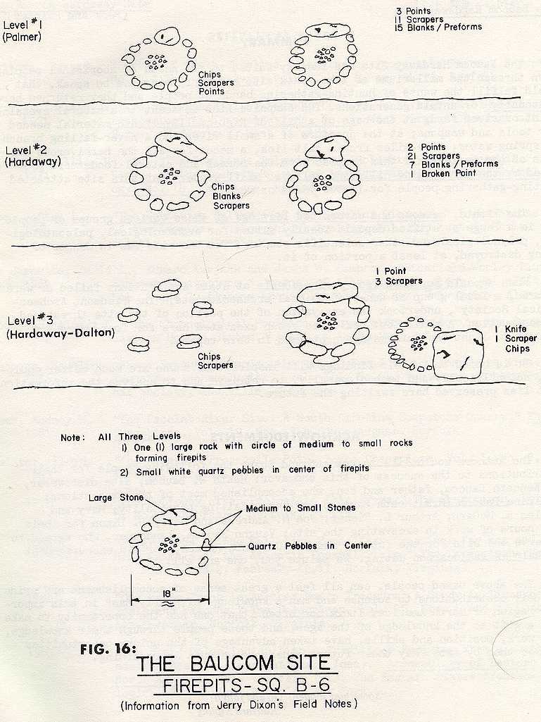 Oral Tradition, the only plausible explanation for the existance of these unique features, cannot be proved or disproved, based upon the evidence available. Two samples of what were believed to be charcoal were recovered from one of the 'firepits' in the Hardaway Side Notch level. Dr. Vance Haynes, however, has discribed one of the samples as a "firm lump (8 x 5 x 5 cm) of pale brown silty, fine sand with dark brownish-grey stains. No distinct charcoal." The other sample is reported to still be in storage. (see page 2, figure 1, for radiocarbon dates associated with Paleo Indian Sites...)