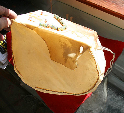 A delicately carved replica of the famous Hopewell Eagle Claw effigy adorns the pipe bundle-lid. The enigmatic and brightly reflective eagle-claw cut-out is made from a sheet of mica and is an exacting replica of the original cut-out, in miniature (the original is nearly a foot long!)