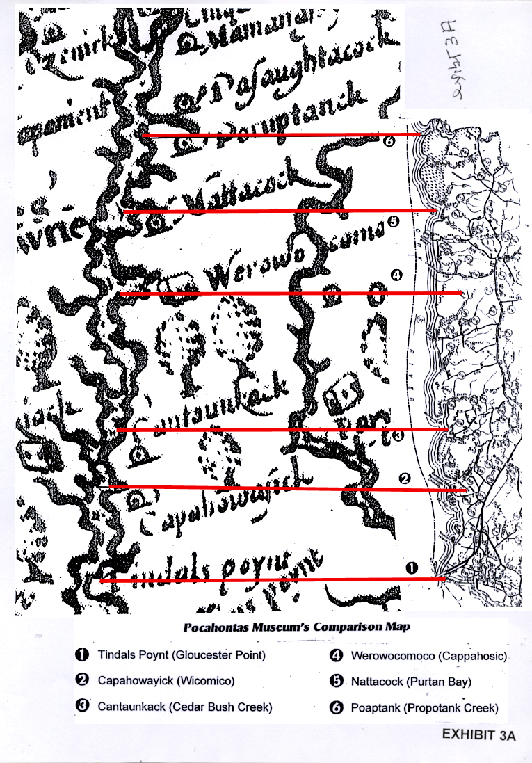 The Research Group’s comparison map is not to the same scale. Their comparison is an alteration of a comparison of Smith’s map and a modern map in the Pocahontas Museum in Gloucester, Virginia. Dr. Randolph Turner (a member of the Virginia Department of Historic Resources and the Werowocomoco Research Group) saw it in 2000, when he visited the museum to identify Indian artifacts that were brought in by citizens. In the museum’s comparison, Poropotank Creek and Gloucester Point are lined up on Smith’s map with a modern map. (