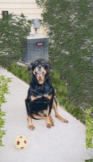 While searching the websites of various animal control, SPCA and other animal assistance organizations, I came across the note above. Accompanying it was a small picture of a large male Rottie. Having lost one of our male Rotties in November of 2003, I had started to look for another one. I had seen several but none fit our requirements. The main two were that the new fur baby get along with the two already in residence and that he not be agressive toward the 8lb cat that wandered in a few years ago and never left.