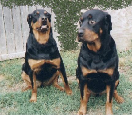 Rotties appear to be the strong, silent, independent types. Right? Wrong-at least about the independent part. They are usually quiet, making a low growling sound if someone is outside that shouldn't be. Bear fits in with the others perfectly. I have a privacy fence backed by a chain link fence. I still have to go outside with them. If I do manage to get them out and close the door, they stand there and look pitiful until one of them whaps the door with a big paw. And heaven forbid that a raindrop hit their precious bodies. The female isn't too bad about this. She will go out in the rain. The boys are afraid they will melt. So, rain, snow, wind (hurricanes) or heat, I'm out there with them. Usually standing out in the rain trying to convince them that they won't melt and to please come outside and go to the bathroom so I can go to bed. Usually doesn't work and I know there will be a 2:30am wakeup call in the form of a wet, cold nose. It's just something you learn to live with when you love a Rottie.