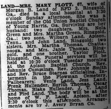 8.MARY PLOTT, born 22 July 1882; died Feb 1950; married MORGAN BUNYON LAND, 14 March 1906.