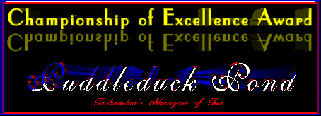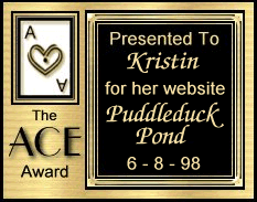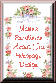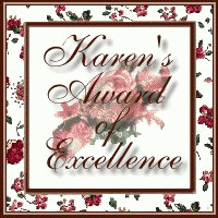These awards were presented to me by fellow webmasters who have deemed my site worthy of their praise. Each award below is very special to me, and is linked back to the truly magnificent webpages of the owners. Please visit them - you'll be glad you did. And to all those who have helped, critiqued, or awarded my site...a very heartfelt 'thank you'.