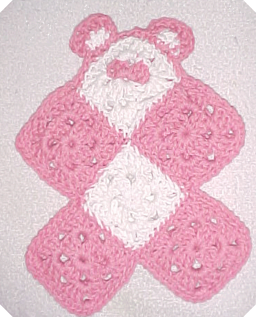 For the face, start with the 2nd color, ch 4, sl st to form ring. Ch 3, 2 dc ch 3, 3 dc in ring. Join mc in top of last dc, and fasten off 2nd color. Repeat as for regular motif. This will give