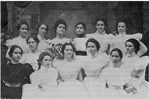 Unavailable to afford a photograph, the first image of Sigma Sigma Sigma in Longwood College's The Light was a pen and ink sketch. The image depicts a skull and cross-bones, lists the sorority colors as purple and green, and also marked the second sorority founded at Longwood.