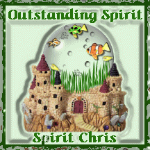 I received this award on March 6, 2000. Congratulations Spirit Chris, I am so proud to present to you the Spirit of the Week award! You were chosen by your fellow Spirits and selected by DSpirit to represent all that Spirits are and should be. This came from DSpirit... I thought you might like to hear it personally.... *smile* " Spirit Chris is an outstanding, dedicated Spirit. He is always dusting, participates in our contest, nominates fighters for the Spirit Award and spreads his spirits to all in the fights. I am very proud to have him as one of my top Spirits with DRealm of DSpirit. Thank you Spirit Chris for all you do. Big Spirit Hug, " =)) DSpirit Please accept this award from all of us here in DRealm of DSpirit and know that we are exceptionally proud of you too! Other comments recieved: The Magic Continues! =) 2000 promises to be a wonderful year for DRealm of DSpirit! Full of Magic and Beauty and Joy. Please join us now and be prepared to be enchanted. This week is a magical week! Spirit Chris is this weeks Spirit of the Week award winner! Spirit Chris is an outstanding, dedicated Spirit. He is always dusting, participates in our contest, nominates fighters for the Spirit Award and spreads his spirits to all in the fights. I am very proud to have him as one of my top Spirits with DRealm of DSpirit. Thank you Spirit Chris for all you do. Big Spirit Hug, ~DSpirit =) Spirit Chris has an awesome website! Please stop in and pay him a visit! *S* if you enjoy seeing happiness and joy, visit Spirit Chris soon! You will be glad you did...*S* Don't forget to sign his guestbook and congratulate him. ~DKindness~ It gives me the greatest pleasure to say Congratulations Spirit Chris , Spirit of the Week! Congratulations, Spirit Chris ! =) ~DKindness~ Send A Spirit Card DRealm Of DSpirit would like you to accept this Spirit Of The Week Award for all you do in Sharing your Spirit! Thank you so much! ~Hope knowing that you're thought of In a very special way. Will add an extra little bit Of sunshine to your day!~