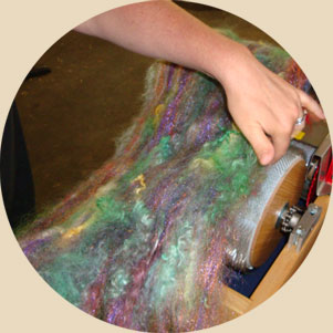 This carder has deeper pins (1/2" long) and course carding cloth (72 teeth per sq. in) on the large drum to accommodate all the fun