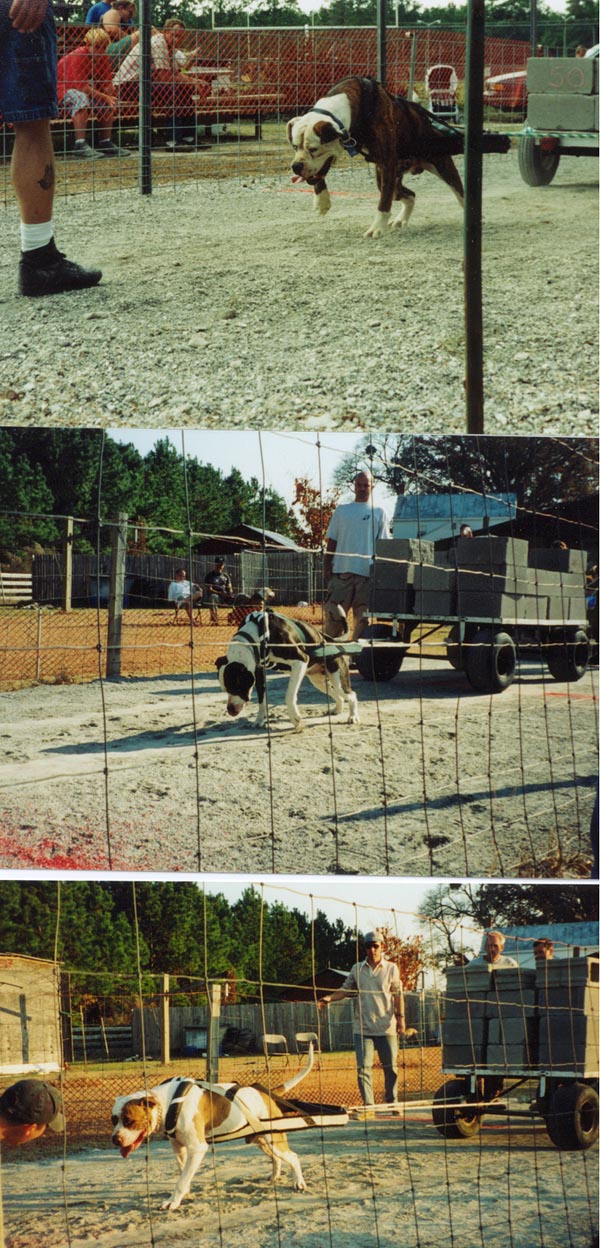 From top to bottom: Mister being handeled by "Crazy Ed". Mister is a brother to our Dozer and Darla. Darla pictured here at Swampdog Kennels getting a workout. Here I am handeling Moose at Swamp Pull '99