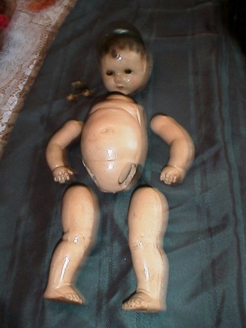 When my Mommy grew up she married my Daddy (Bob Pruett) and I have him to thank for my survival. He carried all seven pieces of me around in a bag wherever we went. They finally found a man who put me back together and now I am very proud of myself. I am not sure I am as proud as my Mommy and Daddy are, for they bought me a new outfit and a white cradle just for me. I now sit or lay in my cradle in our entrance room and when company comes my Daddy loves to show me off to everyone.