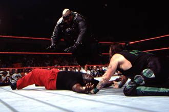 Viscera leaps in the air, preparing to nail "Sexual Chocolate" Mark Henry with his finnishing move.