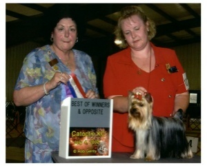 Yes that's right, she’s all grown up. Angel is very lovey dovey, but when it comes to showing, she struts her stuff. This picture was taken when Angel won"Best Junior in a Sweeps "at our Yorkshire Terrier Club of Nations Capital (YTCNC) Specialty 2002. Her namesake Angel Sheridan showed Angel, as proud dad,Patrick, watched the show and mom,Suzie , showed Angel's sister Faith(picutured below). Angel and Faith's Father, Levi, also won "Best Junior in a Sweeps" at the same club Specialty several years back when he was a pup. Angel is an extraordinary Yorkie with endearing qualities. |