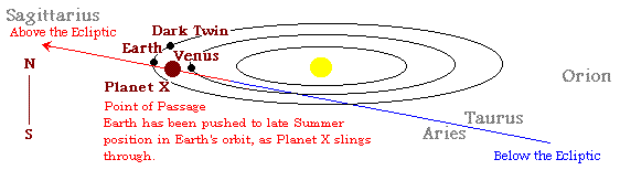 ZT: Early in the ZetaTalk saga we described the ZetaTalk Triangle, the relationship between the Earth, Sun, and Planet X when Planet X pierces the Ecliptic. ... What puzzled many was the placement of Planet X to the right of the Earth, when we likewise had described the pole shift as occurring when Planet X stands between the Sun and Earth, supplanting the Sun's dominance as the largest magnet in the solar system. Based on our more recent description of the 270° roll and the Earth scuttling to the left to avoid the hose of magnetic particles, this triangle can be fitted into the larger equation. At the point the Ecliptic is pierced, Planet X has pointed its N Pole away from the Sun, and toward Earth. Earth reacts by leaning its N Pole away, into the 3 days of darkness predicted for the northern hemisphere. Prior to this [left lean/3 days of darkness], as the N Pole of Planet X is swinging round, the Earth falls on its side, as we have described, the N Pole of Earth to the left in the extreme, thence rolling into the 3 days of darkness as Planet X points its N Pole directly at Earth. This is a rapid and highly dramatic time for Earth, lasting but days at each stage.... (http://zetatalk.com/index/zeta271.htm)
