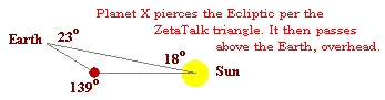 ZT: [Planet X] will come into the Earth's orbital plane not directly between the Earth and the Sun, but forward, somewhat closer to the approach [of Planet X]. The Earth, Sun, and [Planet X] will thus Form a Triangle in the Earth's orbital plane with a 23° angle at the Earth, an 18° angle at the Sun, and a 139° angle at [Planet X]. It is at this point, essentially, that [Planet X] is closest to the Earth, as with the angle of entry into the Earth's orbital plane being 32 degrees at this point, [Planet X] essentially dives up through the Earth's orbital plane and quickly passes on. This ZetaTalk triangle places Planet X slightly to the side of the Earth, not directly between the Earth and Sun, though close to that point. Folklore states that Planet X comes from the direction of the Sun, seeming to be a dragon writhing in the sunlight streaming through the dust cloud that surrounds Planet X. That this is the predictabl[e] location of Planet X, always coming FROM the Sun, is because the Earth is caught in the cup, in an eddy flow, in front of Planet X, and not going round and round the Sun. (http://www.zetatalk.com/index/blog0607.htm)
