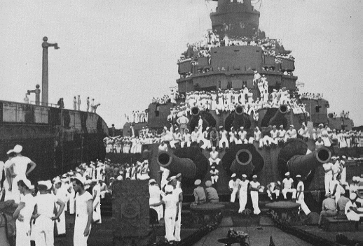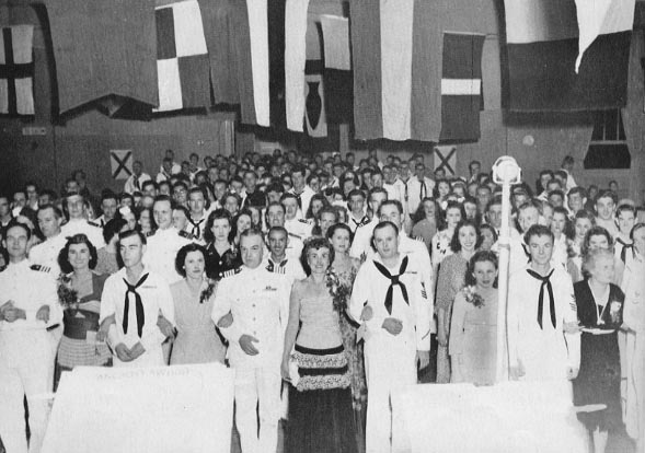 Alabama's First Birthday Party, Norfolk, Virginia (August 1943). (Ten days in port, next stop, Balboa, Panama and on to the South Pacific). Captain Kirtland center front. |