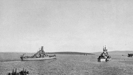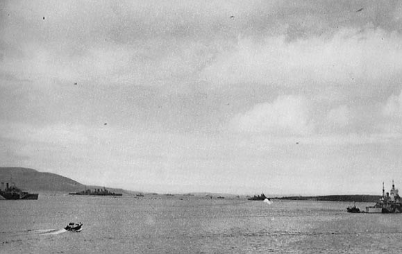 | Note: Faint blobs in the sky at intervals above the harbor. Each blob is the faint outline of a barrage balloon. Each was tethered by steel cable to anchored work boats, referred to as 'Lighters'. Their purpose was to present a nearly invisible hazard to attacking aircraft. Gas in the balloons was explosive. Lightning storms would require some replacement of balloons, due to explosions from lightning strikes. |