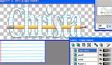 11. Using eraser set on size of about 13, & copy name (top layer) selected, start erasing the parts of the letters the pencil is intersecting alternating so it will look as if pencil is going through the letters.