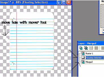 11. with Floating selection still reflected in your layer pallette, choose the merged layer in your layer pallette. click on the scissor which will cut the hole on the merged layer.