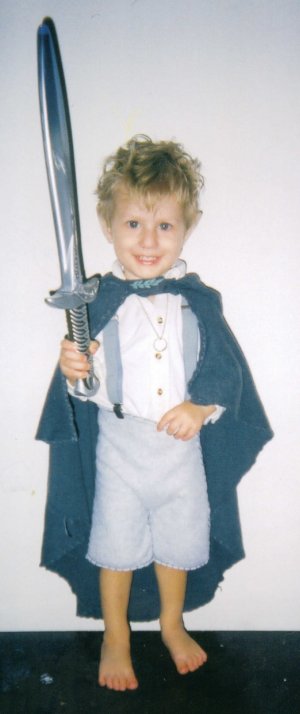 Here is my son's Halloween costume! The cloak and pants I made out of fabric I had left over from other projects. The shirt and suspenders were Isaiah's, already, as was the sword. The ears were from my costume last year, I just trimmed them down a bit to fit his little ears. I put a cheap old ring on a cheap old chain and put it around his neck for that extra something :) I was going to put a wig on him, but he objected, so I put some mousse in his hair and left it at that. I got so many compliments for this costume, too! People were going absolutely nuts over it! They said that it was the best costume they saw all day. Made me blush :) The best part was that it cost me $0 to make. Not bad for the price, huh? :)