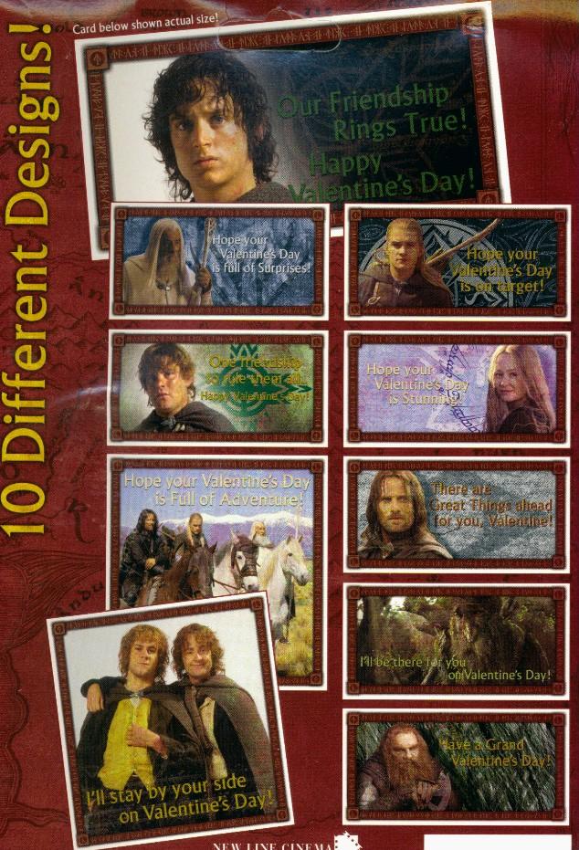 From the back of a box of LOTR: TT Valentine's Day cards. I tried to scan in the Valentines, themselves, but they are holo-foil, so they didn't scan very well. Sam's might still be hard to read - it says: One friendship to rule them all