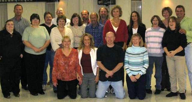 | First row (kneeling, L to R): Natalie Dellinger Roy, Lynn Foley Mowery, Frank Crum, Michelle Taylor Cissell. Second row (standing, L to R): Lori Stokes Dau, Bill Jones, Rhonda Grim Presgraves, Donnie Carter, Barbara Ryman, Tim Moomaw, Sonja Baker Miller, Mark Jordan, Mike Burner, Tim Jenkins, Debbie Sine Skidmore, Lisa Miller Burner, Kemi Gochenour Emmert, Lynne Funkhouser Hoye, Sharleen Litten Schlaak, Greg Hovatter. |