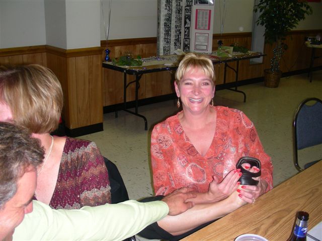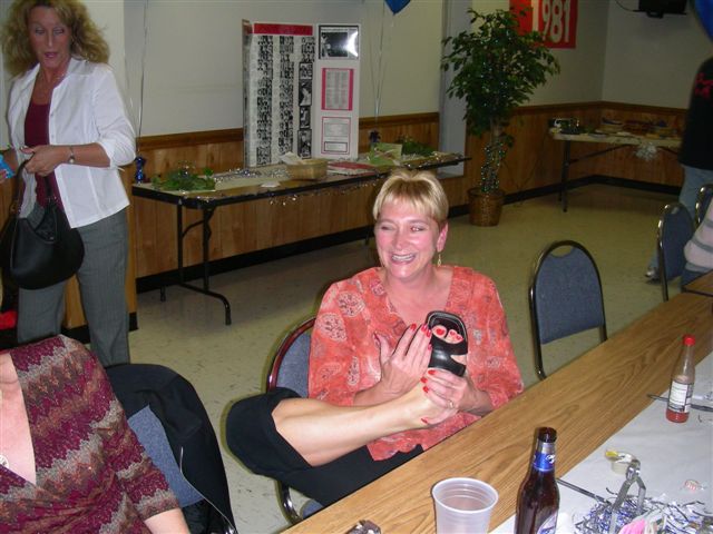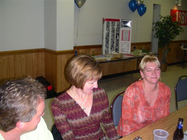 | Greg and Lynne converse with Natalie. Lynne's trifold display with all our goofy yearbook pics in in the background. |