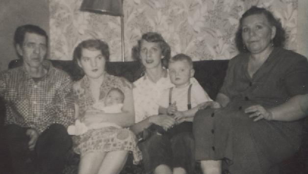 | In the photo to the right, seated from left to right is: Frank Orth (my wife's Step Grandfather), Virginia Boring Ingram (my wife's mother) while holding my wife Carla Ingram Strickland (3 months old), Ethel Boring Vitous holding her son Joe Vitous, Jr (a little over three years old) and Carrie Childers Boring Orth (my wife's maternal Grandmother). | ![]() |