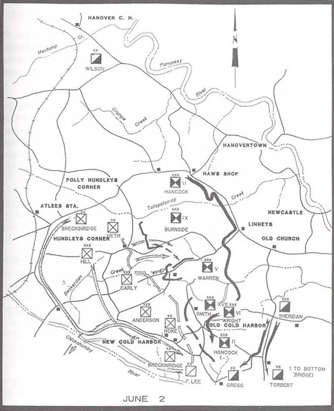 | The Union troops remarkably did not attack the rest of that night and not again the following day, June 2, 1864. Unknown to the exhausted Confederates, General Grant had decided on a early moning action for the 2nd day of June, and had ordered General Winfield S. Hancock to bring his troops to the fray. However, after an all-night march, General Hancock's men were too exhausted to bring any force against the Confederates. This delay afforded General Lee an opportunity to strengthen his position. By late in the afternoon of June 2nd, General Lee was able to gather his entire army along his front, which now extended for more than seven miles.