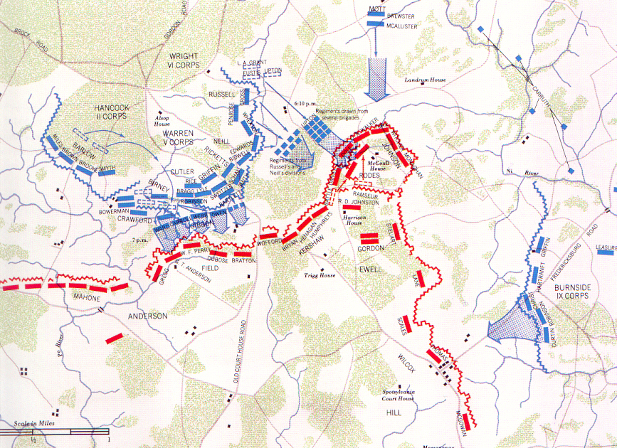 Due to General Warrens failure, the rest of General Grant's plan began to unravel. He postponed the 5:00 PM assault, but some of his commanders did not get the word. General Mott sent his Federal troops forward at 5:00 sharp and was brutally beaten back. General Upton moved against the Muel Shoe and enjoyed great success there. He and his 12 regiments breached the Confederate line, but General Mott who had retreated, was unable to come to his aid. Soon, General Lee counter attacked and pushed General Upton's men back away from his lines. In the meanwhile, at approximately 7:00 PM... General Hancock renewed the attack at Laurel Hill, sending General Gibson's division against General Anderson's center. The men of the First Corps proved worthy and beat the attackers back. This attack again involved Wofford's Brigade as they helped to drive the Northerners away from their position. However, Union Brigadier General Ward's men were able to break through at Confederate General G.T. Anderson's front, but with no reenforcements, was quickly repullsed or captured. |