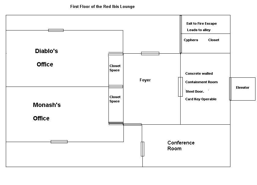 INTERIOR DESCRIPTION Containment Room- Often the first and last thing people see if they are lucky enough to infiltrate the initial securities and gain access upwards in the elevator. Once the elevator doors open the Steel reinforced door is triggered electronically to lock. The elevator doors then close and it descends cutting of retreat. The room itself is concrete walled and featureless. Foyer- Once inside this room you are restored to a sense of being within an office environment. Gray walls and neat furnishings. Other than the steel door there are two other wooden doors, each leading to a different half of the building. Conference Room- This large room too has an officy feel. With a large wooden table and chairs all around it is used mainly for business functions. Cyphers Closet- Is and was for all purposes a janitors closet, however now Cypher has claimed it as his domain and scratched out the janitor sign, replacing it with " Fortress Of Solitude". Diablo's Office- His office is large but doesn't really follow with the theme of the lounge in general. The door is always locked and only diablo has a key to his office. His office is quite large and spacious enough to accommodate a variety of activities. Straight back from the door is his desk which has his phoneline a laptop computer and a high speed internet line along with a variety of other objects and possessions. From his office he can access all of the security cameras through out the entire building. In the back right corner of the room is a small bathroom with shower which can be used for quick clean ups after messy affairs. Also there is a dresser which keeps a modest amount of clothing to allow its owner to change as needed. In keeping with diablo's overly hedonistic desires he had a hottub installed in the front left corner of the office and several thousand dollars worth of electronics ranging from an elaborate stereo system to a big screen tv. He has a leather couch in his office and a futon which can be converted to a bed in a pinch. He has a large leather executive's chair behind his desk and three regular leather chairs in front for business meetings and the like. Monash's Office- Like the rest of the floor Monash's office is done in the same neat but drab style. Having a large wooden desk by the window with leather chairs around. On his desk there is a split screen system which allows him to view the cameras feed throughout the entire establishment. There is also a large bookshelf taking up one of the walls, filled with many books and tombs, some very old and dusty looking. Fire Escape- Simply another closet sized room with a ladder exiting a trapdoor to the roof and another ladder leading from that to the alley.