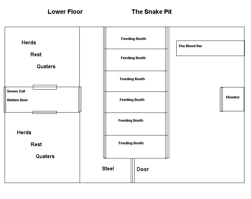 INTERIOR DESIGN Blood Bar- Once you exit the elevator into the blood bar you are offered a seat on any of the plush sofa's or perhaps a seat at the bar. There six stalls immediately in front all with red curtains drawn. The room itself is designed with felt lined walls, red also, and all furnishings are a purple colour. The bar itself is only operational when the owner works it himself. Feeding Booths- Patrons may use any of the six booths for there nights tasks. Each is small though lavishly designed with all the cushy comforts one could want for such things. Each one has a curtain on the elevator and a steel door on the other. Herds Quarters-No expense was spared, for these the rooms that house the life blood of the club. Beds, furnishings, entertainment and a bathroom are just a few of the things these rooms have, to help restore the kine to fit working condition. Sewer Exit- A painting covers this exit in the whole way between the herds quarters. Once removed reveals a small tunnel that leads to the upper levels of the sewers.((sewer lore required)) |