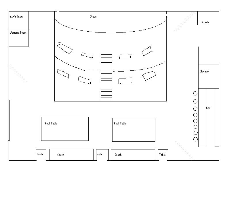 down The Bathrooms: They are bathrooms. That is all. The Arcade: The arcade has a variety of arcade games ranging from racing, to pinball, to fighting games. It also has several air hockey tables and video poker machines. There are a few comfy chairs placed throughout the arcade area. The Bar: The bar is a relatively small one, only able to seat about 8. It has a wide variety of alcoholic beverages along with "special drinks" made to order for guests with special needs. Behind the bar is a closet which has in it a large inflateable pool and a copious amount of pudding in case desputes must be settled among female patrons. |