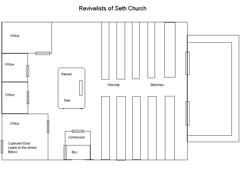REVIVELISTS OF SETH. The revivelists of Seth church has been operating just off state street on the east side for almost two months now. It is a lutheran religon in every sense of the word, being wholey unique in its form of worship. The building itself is set on a green grass block and is made entirely of concrete in the modern style. A simple black and white sign sits at the entry of the carpark reading"Revivelists of Seth Church". Steps lead up to the large double doors of the church. Inside is a white decor lined with row after row of benches for the faithfull. In front of these resides a raised dias, where the priest may dictate his sermons. Behind this area are four offices for private conference and a confession box. One of these offices has a steel cabinet with a numerical key on it. This is the doorway to the true place of worship.
