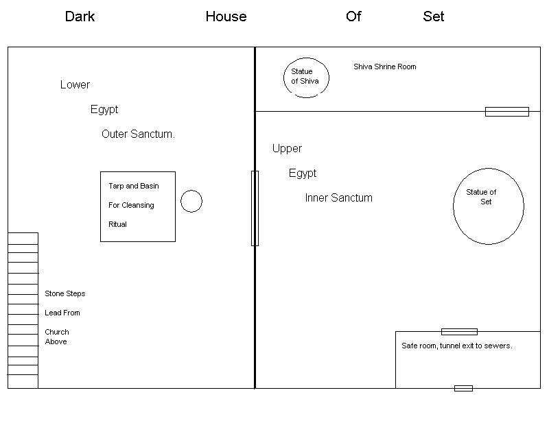 DARK HOUSE OF SET Once the remote door clicks closed you are plunged into a heavy darkness common with underground tombs. A little light gradually returns as you get to the bottom of the stone steps, provided by softly burning wall scones. The floor is cement and very dusty the floor the same too. The only real features of this the outer sanctum are a mat and water filled basin designed for entry ceremony into upper Egypt. Walking through the double doors will take you to the white sandy floors of upper Egypt. Here in the inner sanctum resides the main shrine to Set. In the centre of this room stands an eight foot statue of Set himself, in reptile form. The statue is carved from a single piece of obsidian. To both the left and the right of the statue lay two more doors. The wall in this room to are cement, only rendered to a red dusty colour and delicately inscribed with heiroglyphs. The one on the left leads to the Daitya shrine of Shiva. In here resides a wooden idol of the elephant headed god. The one on the right leads to a small concrete room. The inside of the door has a submarine style locking system. The only other feature is a small tunnel, roughly the size of a human head leading to the sewers.