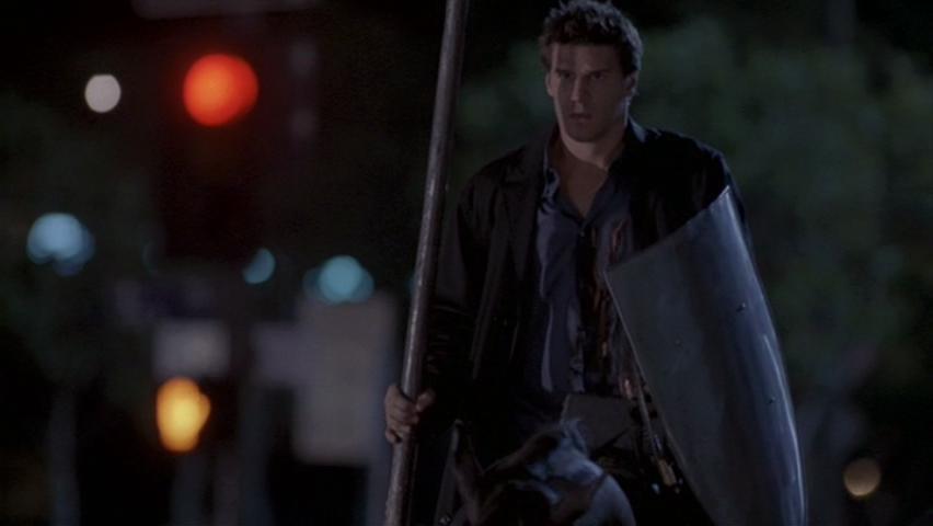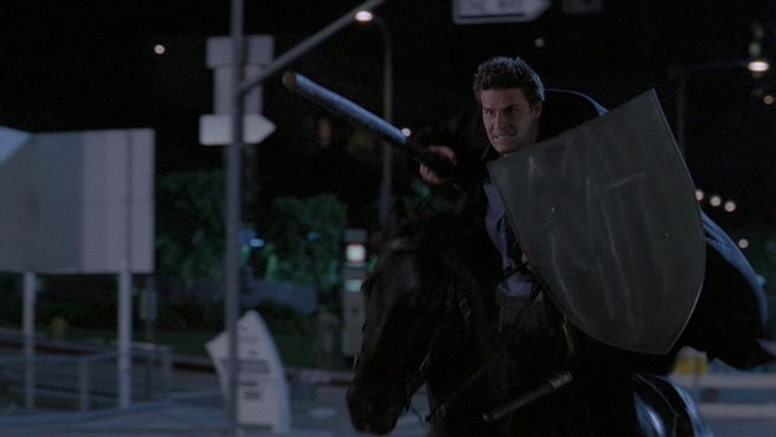 Angel rides really, really hard to get the event over with, so he can get back to his Xanderkins.