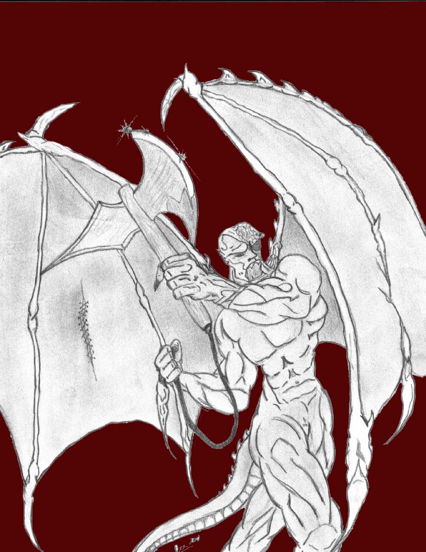 Over 8ft. tall and 700lbs of ugly Gargoyle. A massive scar burn covers the left side of his face and a black patch the empty left eye socket. His weapon harness is adorned with multiple knives. Something that looks like it was once a Thomspon SMG is highly modified and strapped to his right hip. A 6' of Dasmascus steel death rides strapped between his wings. The silver Nodic bracers remain as well as the Aires House Symbol (a winged serpent biting its own tail) and Angel Torc around his neck. The gaze of his one good eye holds cold death. "Dulche et decorum est pro patria mori."