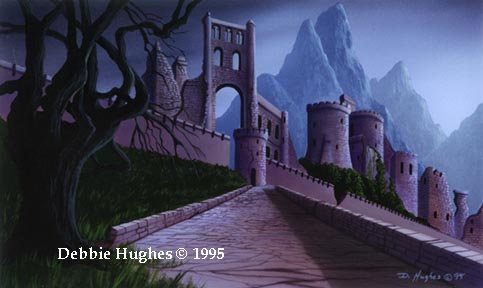 You have no idea of how you arrived here, but one thing is for certain you are in a different place. As you look up towards the night sky, the alien landscape becomes more evident. Above you are six moons and foreign star formations. With a deep sigh and trepidition, you push onward uncertain of what you will find. You continue to walk for what seems an eternity in the dark forests. A fleeting light is seen up ahead through the swaying branches. Soon your feet thread upon a paved road of masonry. Your steps quicken and you enter a couryard with soaring dark gray cyclopean walls that seem to engulf the night sky.