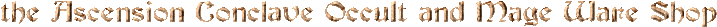 A weathered iron wrought sigh announces that this is the Ascension Conclave Occult and Mage Ware Shop. As you push open the thick black cherry wood door, a jiggle from a small silver bell announces your arrival. Upon entering the old shop, the bitter sweet musky scent of dried rose petals, decaying bat wings, spices, and cinnamon intermingled with other exotic aromas caresses your nostrils. Up front is the shop counter, the walls are lined with endless rows of tomes on every subject from top to bottom. By each shelf, a great oaken ladder with small wheels at the bottom rests waiting to be used to retrieve tomes from their high perches. Glass display cases, located in the center of the shop and near the shelves, present various objects collected from across the known realms. A thick black velvet curtain separates the main room from the smaller rooms which house weapons and jars (( both glass and clay )) that contain special spells components.