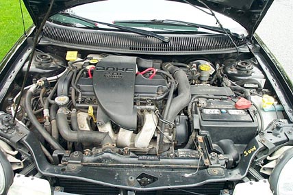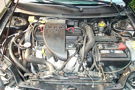 This engine's a DOHC, and mostly stock compared to the red Neon's engine. The red wires are from MSD ignition.