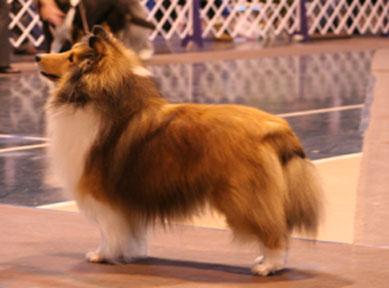 This young dog is surpassing our expectations both in the show ring and as a sire. He finished his championship at 17 months of age with 3 back to back majors. After growing up just a bit ( and with a little more training under his belt ) we decided to try specialing him. In January of 2008 he won his 100th Best of Breed earning him a place in the prestegious Century Club with many group wins and placements along the way. He and Carol have now retired from the show ring and Airen is living a pampered life with his beloved handler Carol. His first litters have begun to hit the show rings and a few have earned points from their puppy classes. Two are looking for their majors to finish. Airen is 15 3/4 inches, pure for sable, non white factored, vWD clear, OFA Good. He's consistantly producing pretty expression and great legs. His puppies all seem to have his fun loving, outgoing attitude.