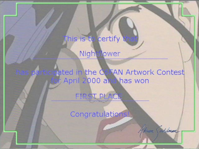 I got a nifty certificate thingy saying I won first prize in the C6FAN art contest! Click here