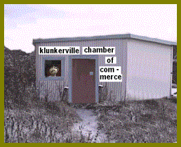 We at Klunkerville just had to include one of our popular landmarks to make this page complete. This is a picture of the beautiful Chamber of Commerce building founded by Clarence Klunk Jr. in 1909. It was a former hen house owned by one of the farmers. At first the farmer agreed to let them use it just as long as they agreed that he could keep a few chickens in it. The chickens soon died and the farmer gave the building to the town. Clarence Klunk Jr. did miss the eggs. They came in handy for the noontime meal.
