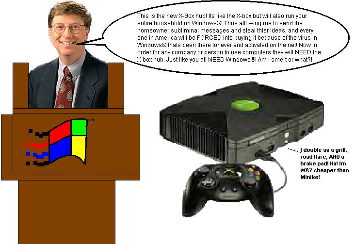This is a comic I made of Bill Gates unvailing the "X-Box hub" (yes hes acctualy making one that will run you TV DVD Comp and other stuff)